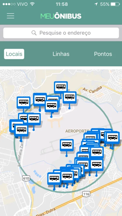 · Selecione o ponto de parada desejado e visualize as linhas que passam por este ponto e suas respectivas previsões de chegada;