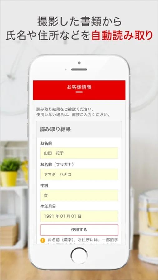 OCR(光学的文字認識)技術の利用により撮影した本人確認書類から氏名や住所などの情報を自動的に読み取ります。読み取った情報を入力項目に反映することにより入力の手間が省けます。(撮影環境により読み取れない場合があります。)