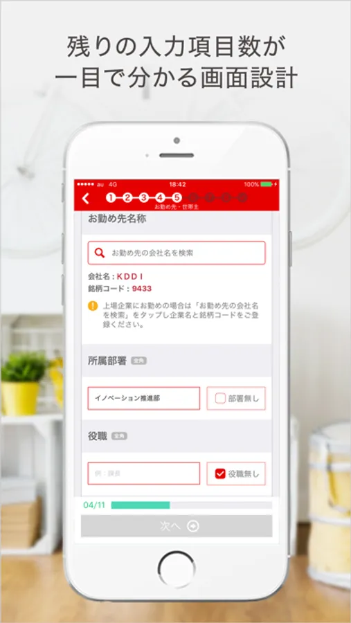 残りのページ数や入力項目数が視覚的に分かるナビゲーションやプログレスバーの表示や、狭いスマートフォンの画面を少しでも広く使うためにヘッダーやフッターの大きさを動的に変化させるなど、入力ストレスを軽減する工夫を行った操作性の高い画面設計となっています。