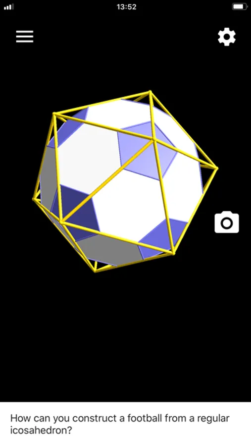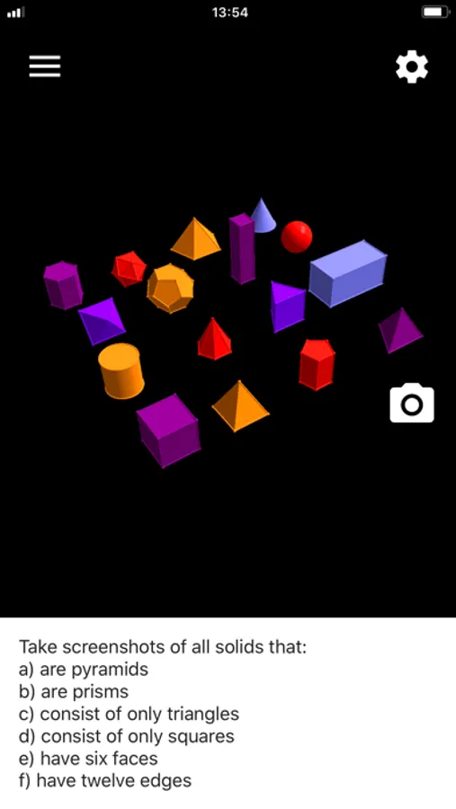 This app includes several examples of 3D math objects that you can place on your table, floor or any flat surface around you. Guided activities lead you to discover math in the real world by taking screenshots from different perspectives.