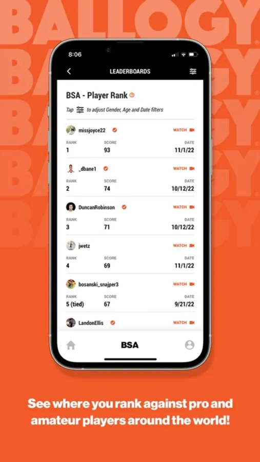 Video of the test is captured in the Ballogy app and is immediately reviewed, verified, and scored by Ballogy certified coaches and added to the athlete’s profile. When taken consistently, BSA scores create a perfect snapshot of a player’s shooting progress over time and quick comparison of their shooting abilities with players from around the world.