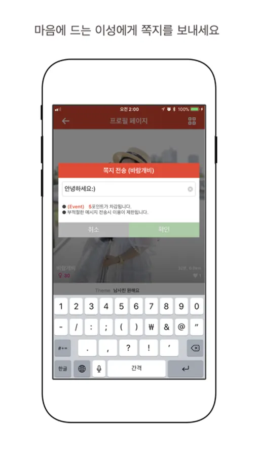 3. 음란하거나 선정적인 프로필 사진 및 성기∙성행위를 비유해서 불건전 만남을 유도하는 게시글은 본 서비스에서 유통을 금지합니다.