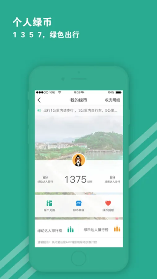 5)绿币功能。本应用读取运动与健身中的步数,同步到应用中,特别推出“1357绿色出行”绿币兑换功能;
