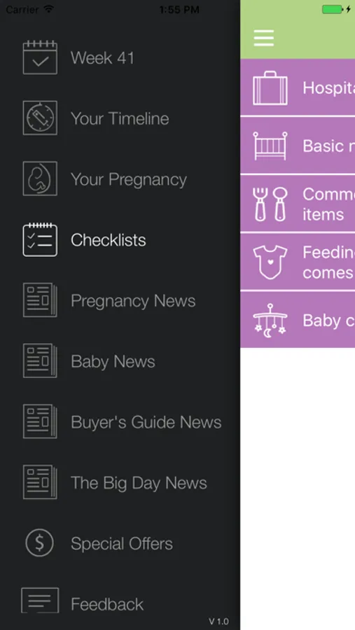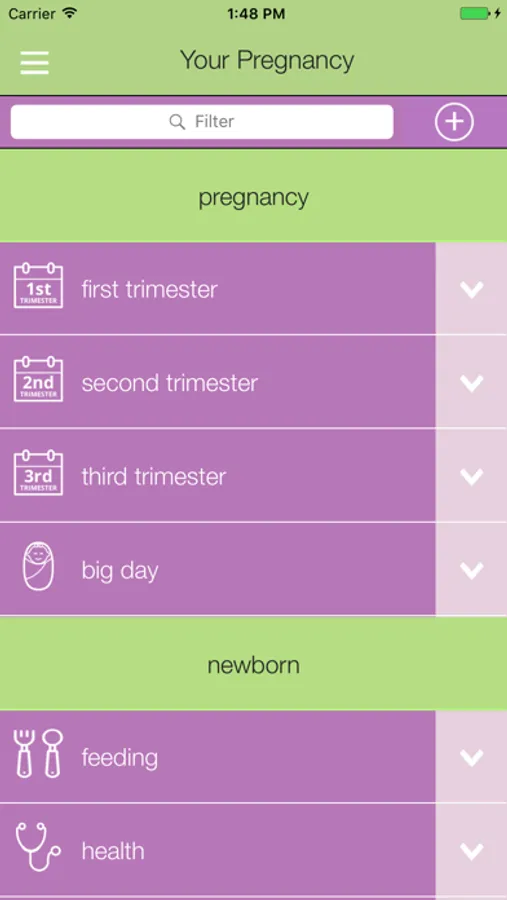 * weekly updates for each new stage including the size of your baby, information on his development and what is happening with you, your health and your relationships
