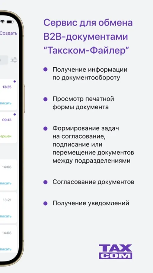 Такском-Файлер – сервис для обмена В2В-документами в электронном виде с помощью мобильных устройств. Приложение позволяет пользователю оперативно просматривать, согласовывать и отправлять на согласование документы, получать информацию о состоянии документооборота с контрагентами.