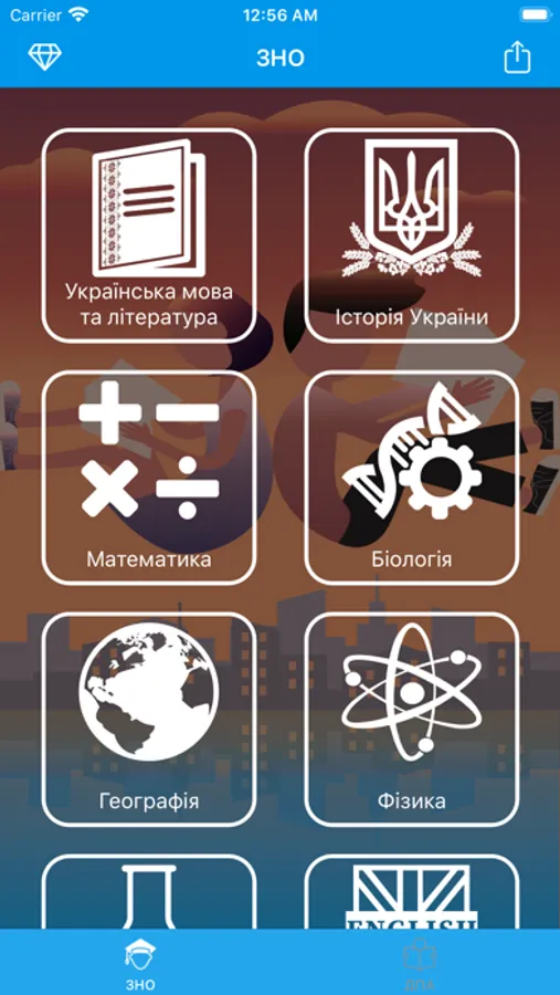 У мобільному додатоку є такі предмети: Українська мова та література, Історія України, Математика, Біологія, Географія, Фізика, Хімія, Англ.мова, Рос.мова а також пробне тестування по всім предметам.