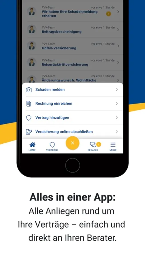 Mit der FVV-App haben Sie Ihren Versicherungsordner immer dabei: Sie bietet Ihnen den einfachen und übersichtlichen Überblick über Ihre Versicherungen, die Sie bei uns abgeschlossen haben. Sie haben aber auch die Möglichkeit, Verträge, die sie bei anderen Anbietern abgeschlossen haben, hochzuladen und in der App zu verwalten oder sogar auf Ihren ausdrücklichen Wunsch von uns prüfen zu lassen.