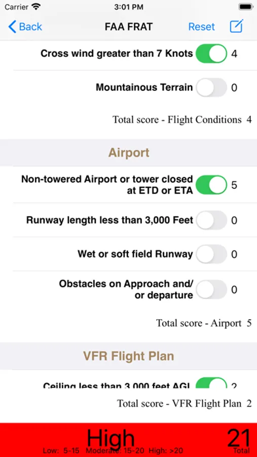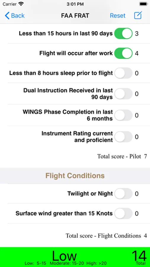 The tests you create can contain simple yes/no questions, numeric questions, or text input fields. For example, the FAA FRAT give a 10 point credit if the pilot is IFR rated (a yes/no question), or you could create a numeric question where if the pilot has less than 25 hours in type they score 5 points; less than 50 they score 3 points, etc.