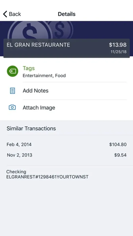 Add Tags, Notes, Images & Geo-Information: By enhancing transactions with custom tags, notes or photos of a receipt or check, you have the ability to stay organized and find exactly what you’re looking for when searching through your finances.