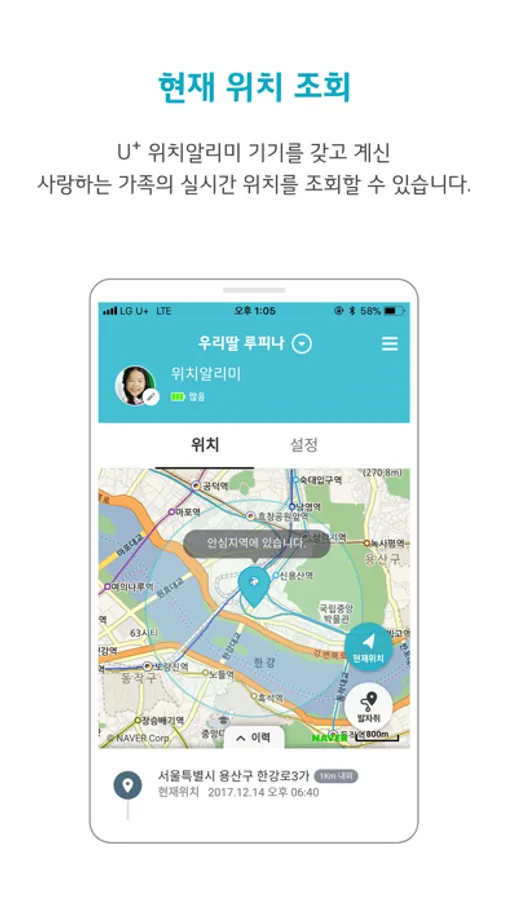 아이와 노약자 등 보호할 대상의 현재 위치를 조회하면 지도에서 확인 가능합니다.