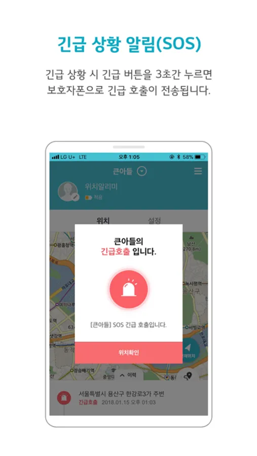 보호할 대상에게 위급 상황이 발생할 경우 긴급 호출 버튼을 누르면 보호자에게 알림이 자동 전송됩니다.