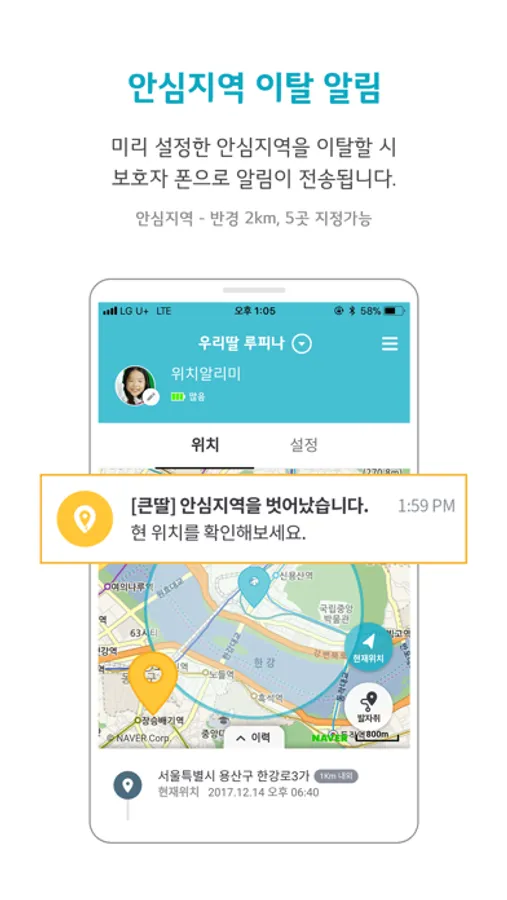 보호할 대상이 미리 설정한 안심지역을 벗어나면 보호자에게 알림이 자동 전송됩니다.
