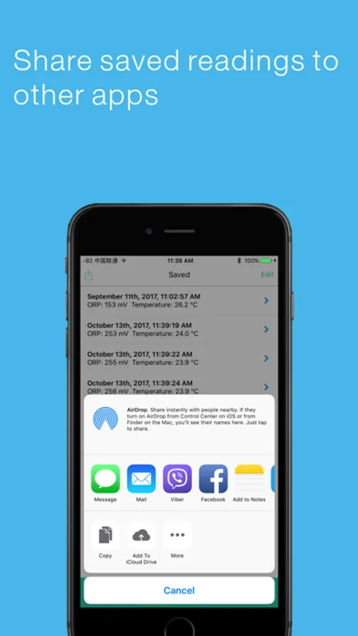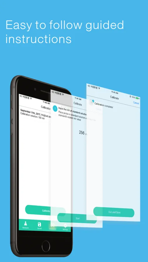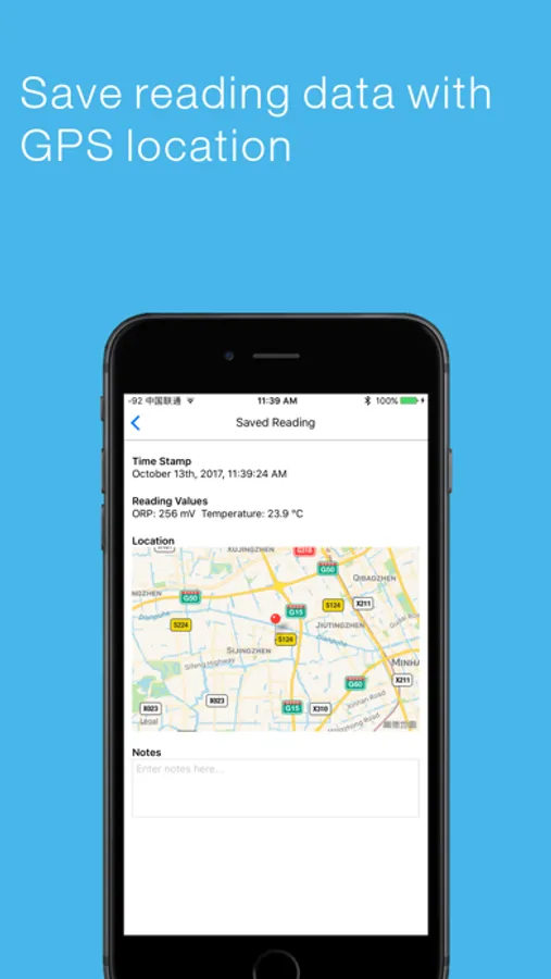Geo-tagged data storage, reading quality indicator, data sharing, temperature display, calibration reminders, calibration log, and more.