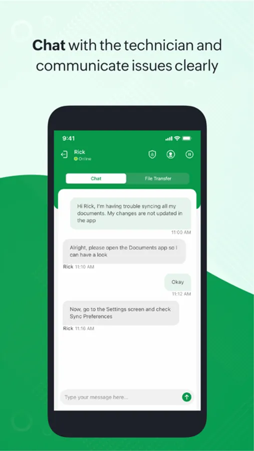 4) After going through the screens and getting an idea of the problem, the technician can communicate with you through the in-app chat. This will be ideal when the technician wants to send you instructions or ask you for quick clarifications.