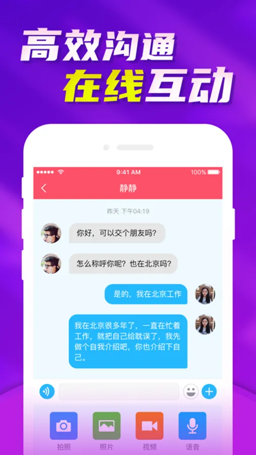 全新的婚恋相亲模式,丰富的恋爱社交功能,大家在线尽情畅聊,聊开心再见面,轻松脱单!