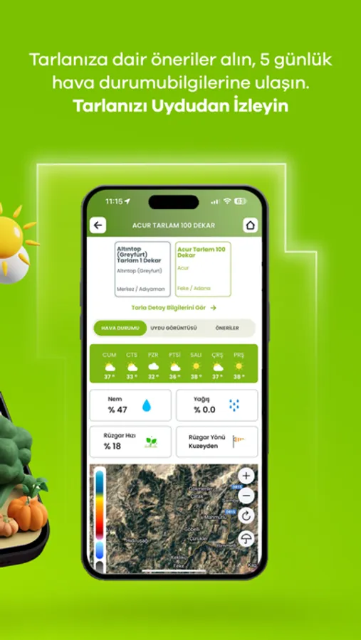 • Tarlanı, sana düzenli iletilecek uydu görüntüleri ile takip edebilir, az gelişmiş ya da sorunlu bölgeleri anında tespit edebilirsin.