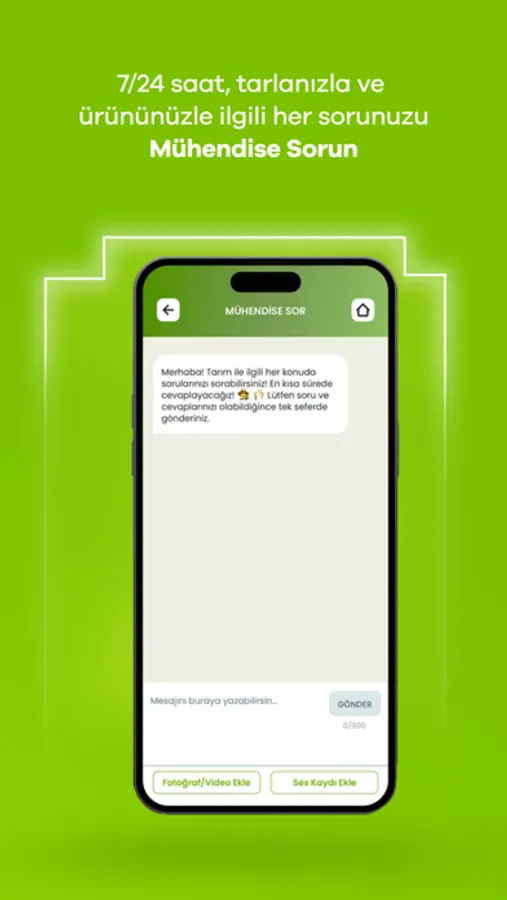 • Tarlanda yetiştirdiğin ürün ile ilgili tüm sorularını; konusunda uzman ziraat mühendisi ekibimize fotoğraf, video, ses kaydı veya yazılı olarak aktarabilirsin.