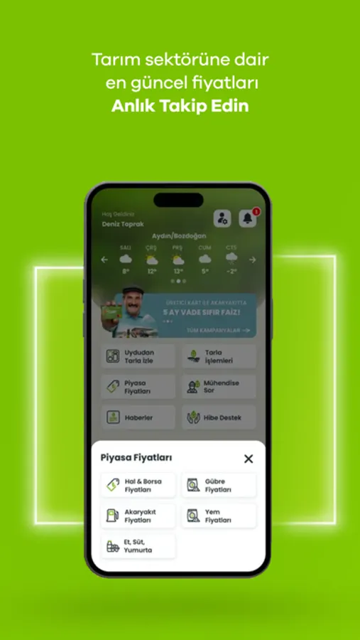 • Tarım sektörüne dair tüm gelişmeler, haberler, resmî duyurular, hibe ve destek açıklamaları, avantajlı kampanyalar, bildirim olarak telefonuna iletilir.