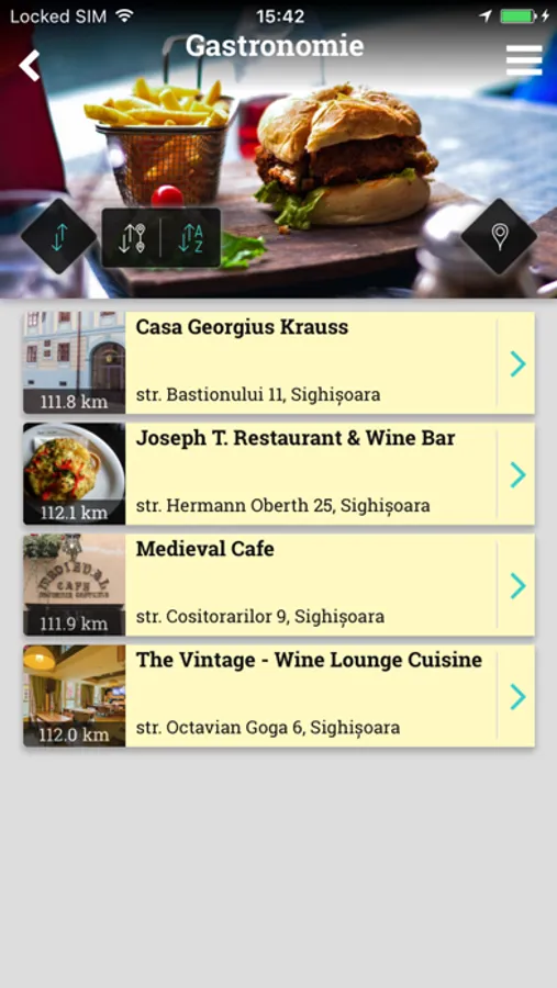 Toate elementele pot fi sortate alfabetic sau dupa distanta. De asemenea, se pot folosi optiuni de filtrare, in functie de tipul de punct de interes.