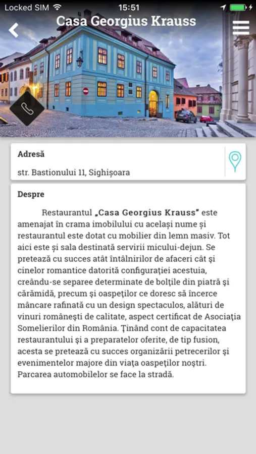 Toate punctele de interes contin detalii precum: imagini, text, adresa, telefon/telefon mobil cu posibilitatea de apelare directa, adresa de email cu posibilitatea de a trimite mesaj folosind functia email a telefonului, website, orar, locatie pe Google maps si optiuni de navigatie.