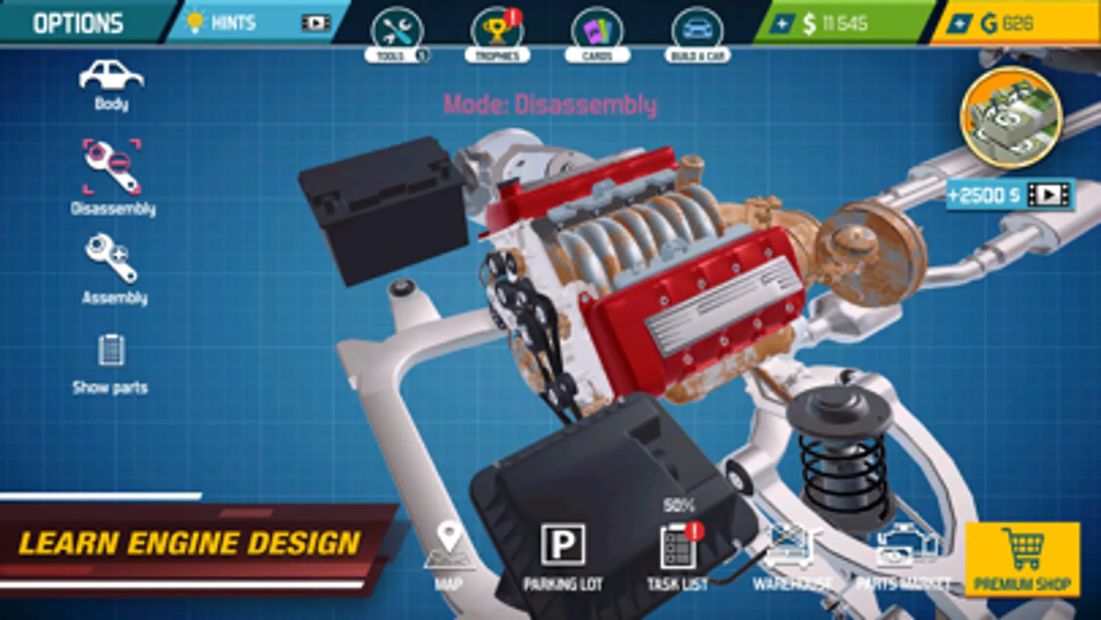 - Realistic car parts (ABS module, brake caliper, drum wheel cylinder, air filter, belt tensioner, cam gear, and much more)