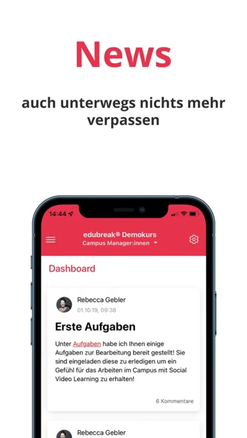 Verpass keine neuen Aktionen in deinen Kursen oder Reaktionen auf deine Beiträge. MIt den Push Benachrichtigungen der edubreak®APP wirst du immer direkt auf deinem Smartphone informiert, wenn es etwas Neues gibt. Auch, wenn du die App geschlossen hast.