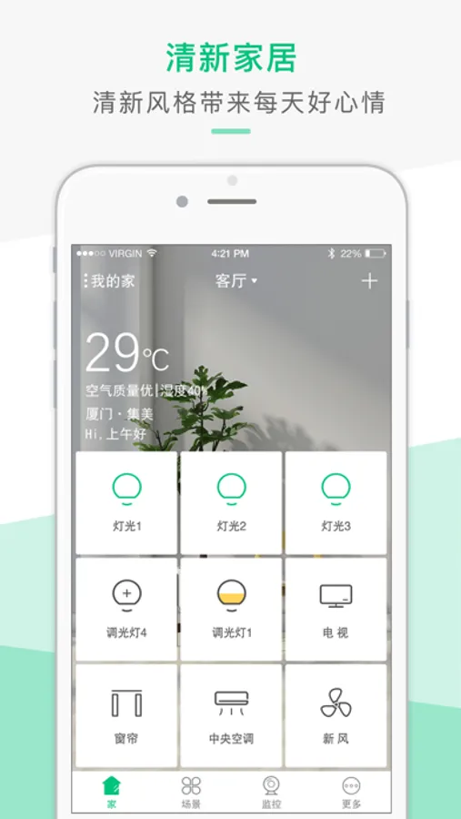 立林两线制智能家居实现对立林科技公司的智能终端进行基于互联网的远程控制功能,包括家居控制,家居管理,安防管理,视频管理,设置等。家居控制包括中央空调、红外空调、红外电视、泊声音乐,灯,不可调灯,窗帘,传感器等。
