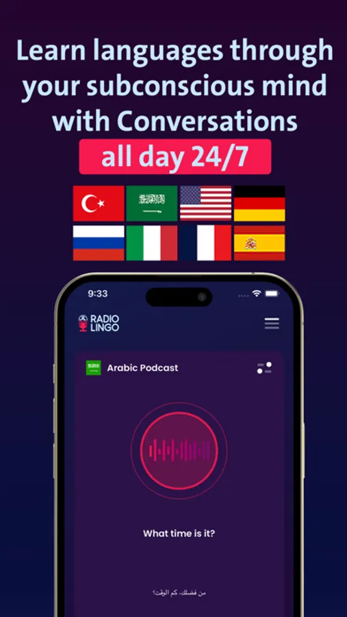 With RadioLingo, you can explore a new world of languages in a way you never imagined before. Immerse yourself in real conversations translated into the most widely spoken languages worldwide, 24 hours a day, 7 days a week. All of this with precise pronunciation from native speakers.