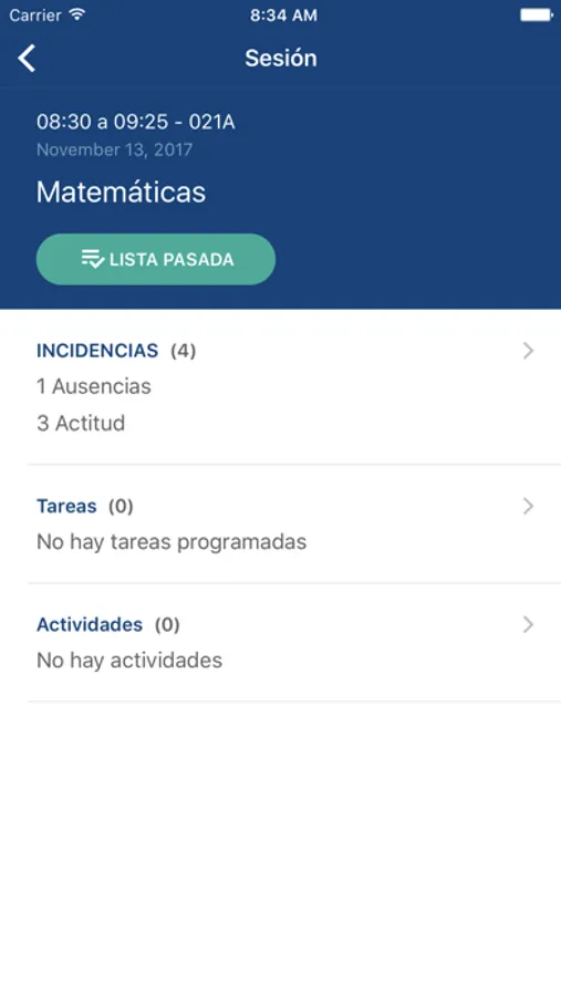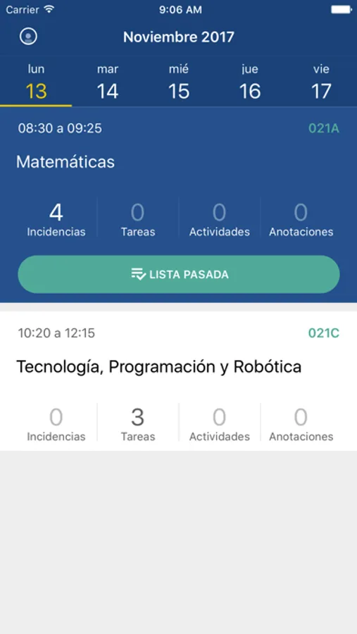 Su pantalla principal es una agenda que muestra por defecto todas las sesiones planificadas para ese día, destacando aquella que esté más próxima a la hora de conexión, y con un acceso directo para pasar lista.