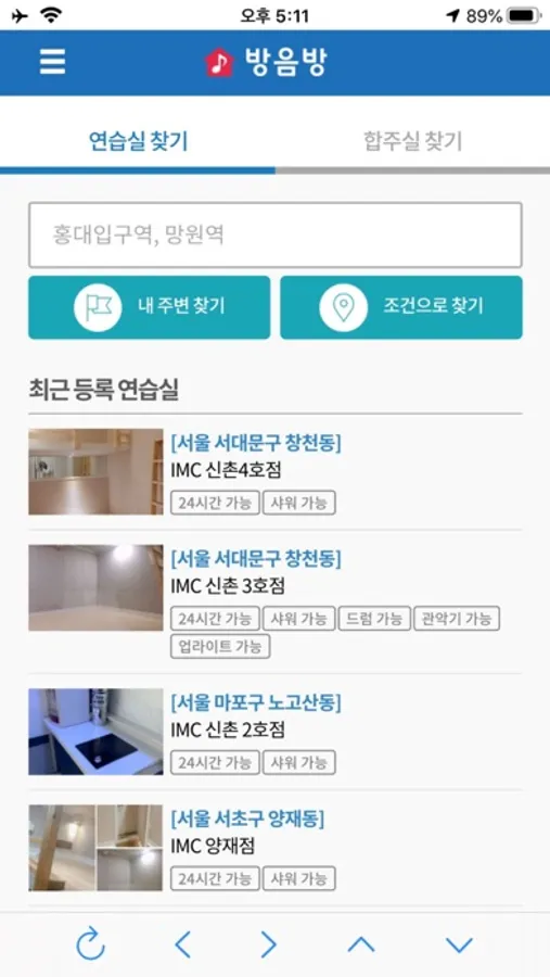 ▶ 24시간 이용 가능 여부, 지상 지하 여부, 샤워 가능 여부, 에어컨 유무 등 연습실을 선택하시는데 필수적인 정보들을 방음방이 꼼꼼히 체크하여 손쉽게 검색해 보실 수 있도록 만들었습니다.