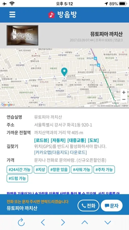 ▶ 연습실, 합주실까지의 자동차, 대중교통, 도보를 이용한 길 찾기 (경로