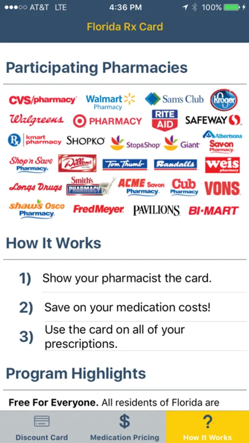 pharmacies across the state of Florida including CVS/pharmacy, Walgreens, Walmart, Kmart, Albertsons, Kroger and many more. Simply bring this app to the pharmacy with your prescription and save!