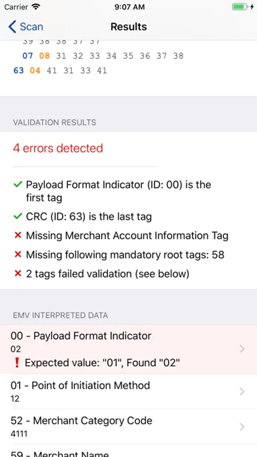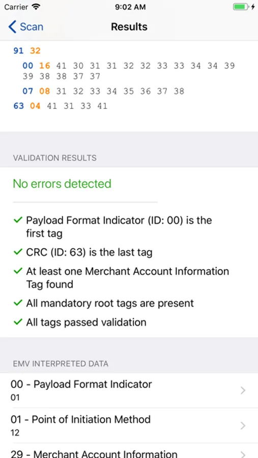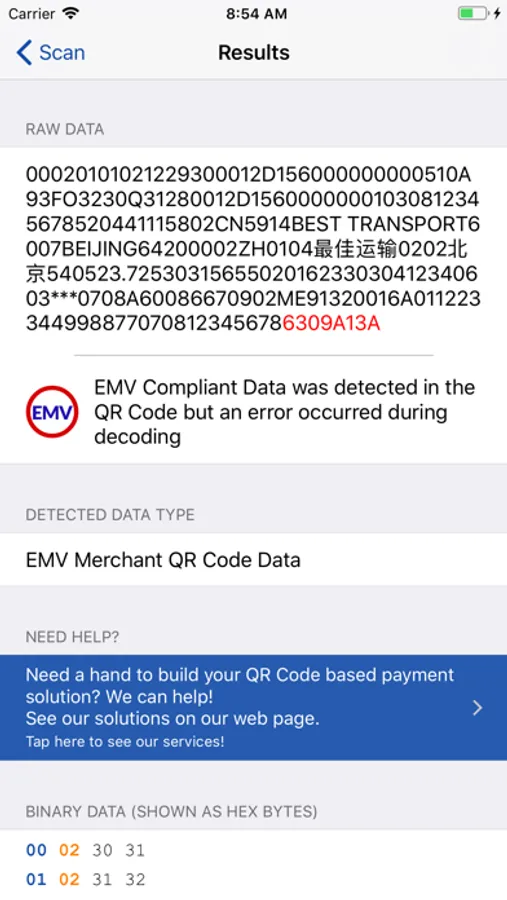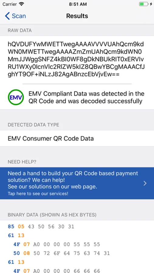 This app will decode QR Codes that are compliant with the EMVco specifications for usage of Merchant and Consumer QR Codes in the payment business. It will show the raw data contained in the QR Code, show it as Hex Bytes and give available information for all EMV tag found. Helps you find problems in QR Codes by highlighting parts that could not be decoded. Also does a complete analysis of Merchant Presented QR Codes to highlight missing tags, tags with bad length or format, and Checksum value.