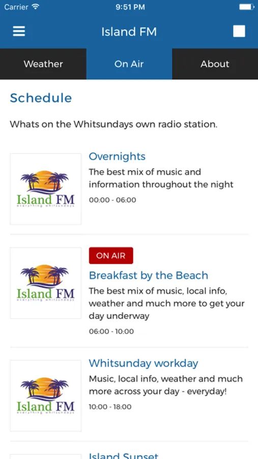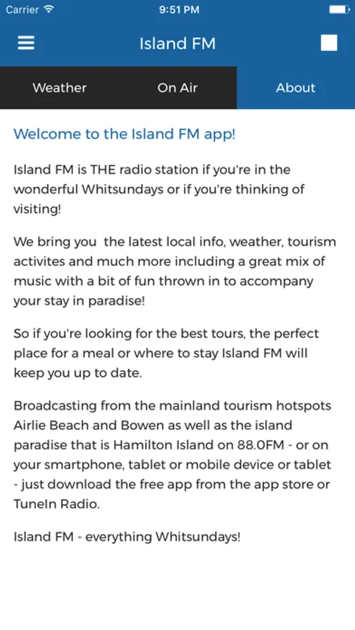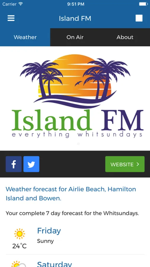 Island FM - everything Whitsundays! Broadcasting to Airlie Beach, Hamilton Island, Bowen and the Whitsundays on 88.0 FM or listen to us from anywhere on your smartphone, tablet or the web. Get the latest info, news and weather from the wonderful Whitsundays.