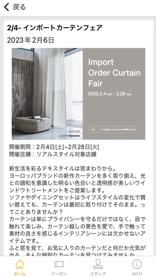 アプリからは,最新のインテリア情報やお得なクーポンを配信していきます。