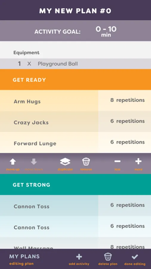 In the Daily Plans feature, FunDoRoo has lesson/activity plans that are 25-45+ minutes long. The 50 pre-made plans include the activities from the curriculum. The plans follow a progression for duration as well as for difficulty of the included activities. The plans indicate as well the total estimated duration and whether they are better suited for small spaces or if little equipment is needed. It is also possible to customize and design new lesson plans within a few clicks.
