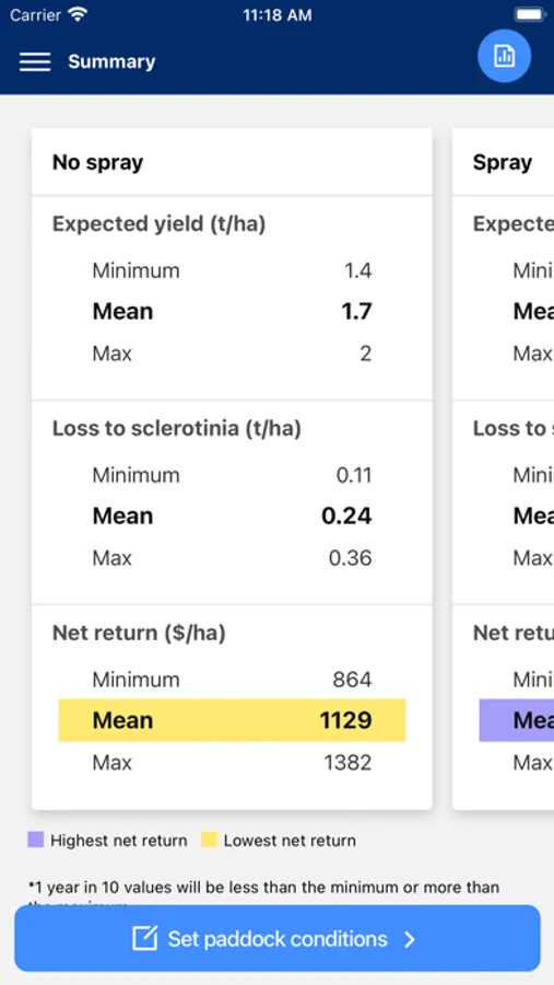 SclerotiniaCM takes account of costs, yield benefits, grain price, and seasonal conditions to give you best case, worst case and most likely estimates of financial return.