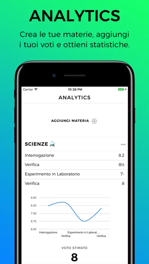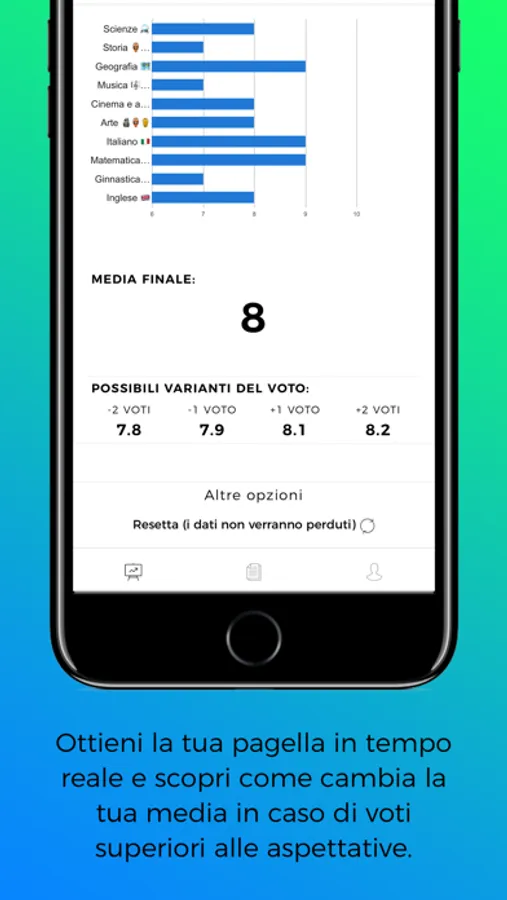 Inserisci i voti man mano durante l'anno scolastico. Analytics ti mostrerà all'istante le variazioni delle tue medie e delle statistiche.
