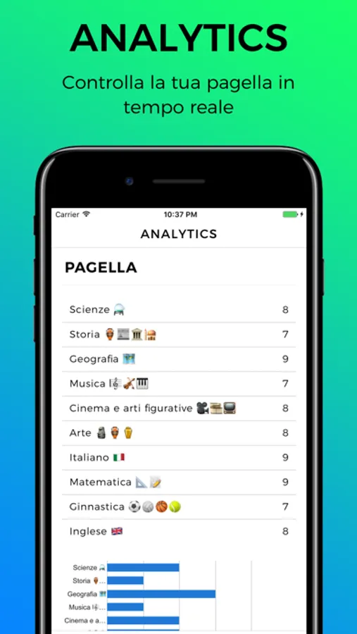 Analytics ti permette di scegliere le tue materie e di personalizzarle, aggiungendo emoticons o cambiandone il nome. Puoi modificarle in ogni momento.