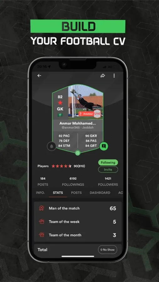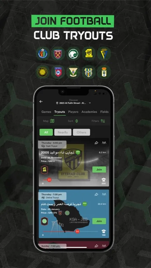 كوّن ملفك الرياضي و حمل أهدافك و مهاراتك و شارك إحصائياتك بعد كل تمرين, عندنا كشافين مواهب ينظموا تجارب أداء تساعد اللاعبين لفرصة الإنضمام لنادي محترف و بداية مسيرة النجومية في عالم كرة القدم!