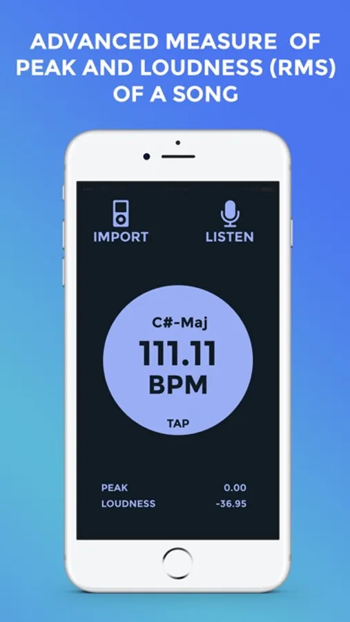 Let your device listen to the music around you to analyze the BPM, the key chord (Major or minor), the peak and the loudness value in dB.