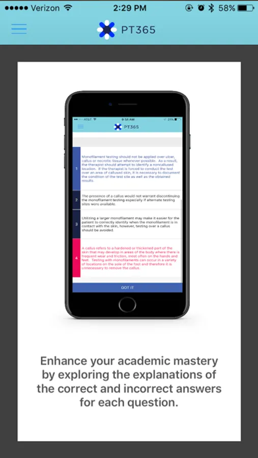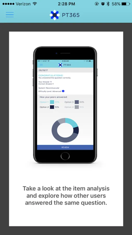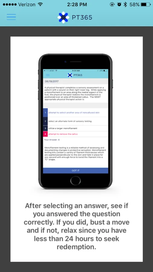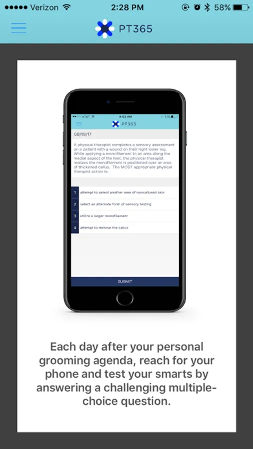 Physical therapists and physical therapy students have a unique daily opportunity to assess their mastery of essential physical therapy content by answering a single multiple-choice question. Think of the app as your daily PT vitamin! A complete explanation of both correct and incorrect options is offered for all questions. The app provides users with a method to track their performance over time answering questions of varying complexity and to compare their results to the relative performance of other users.