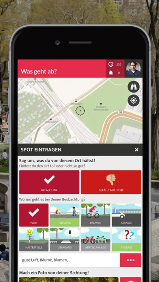 "What's going on?" is a "Talente Regional" Project, in which 5 school classes from the 21st district in Vienna are confronted with topics like mobility, road safety and public space. By undertaking workshops and study trips the children are encouraged to understand the topic mobility interdisciplinary in connection with environment, health, psychology and technique. In the framework of the project this application was developed in order to offer the project classes as well as classes from other schools the possibility to create a interactive map. This App enables children and teenagers to visualize public spaces from their own viewpoints.