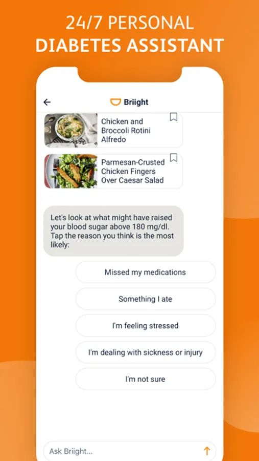 Download today and get a personal diabetes assistant, Briight, at the push of a button available 24/7; a diabetes log; access to a range of healthy diabetic recipes; tools to help you maintain a normal blood sugar level and much more!
