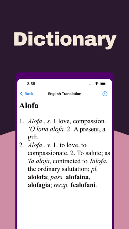 • Dictionary: Access 10,000 Samoan-English audio pronunciations for each word and an option to pronounce slowly