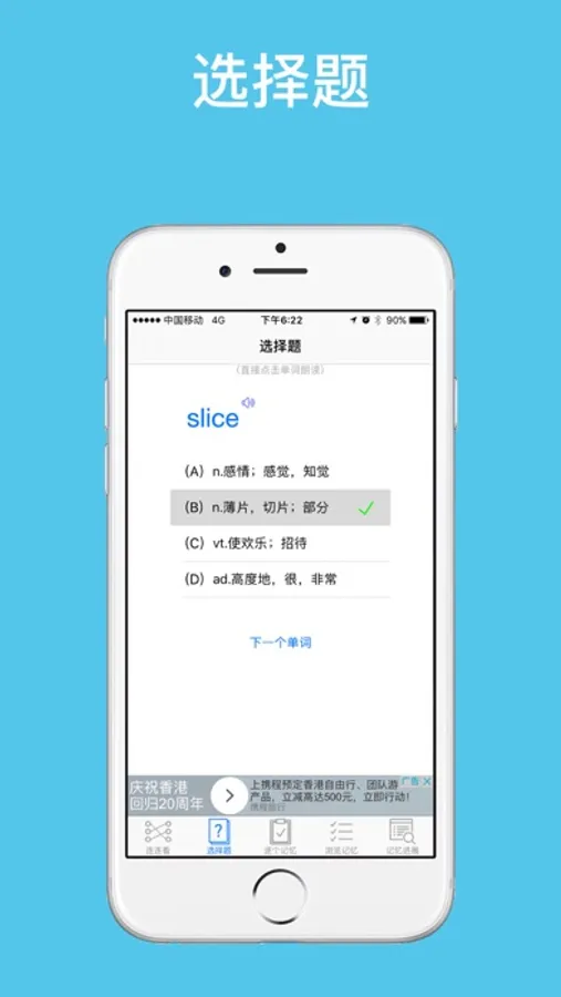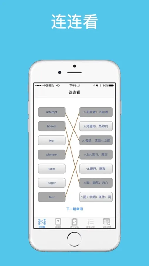 本应用正是抓住这一关键,在你玩连连看、做选择题、随性浏览记忆的时候,程序内部正科学地帮你管理着记忆进程,该当重复的单词会自动在恰当的时机出现,帮你强化记忆、加深记忆。