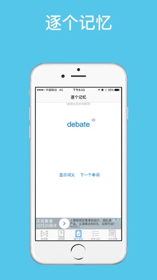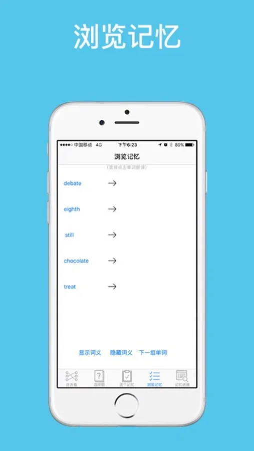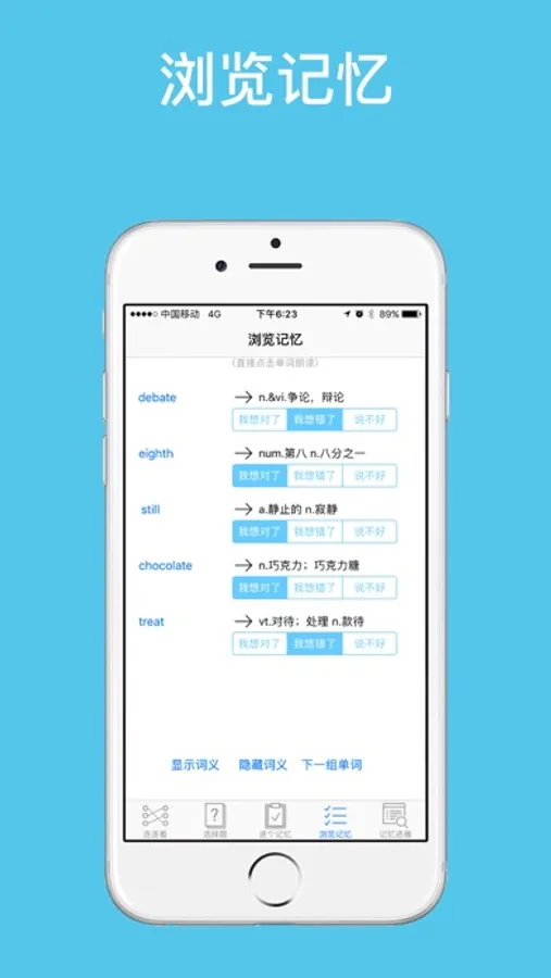 本应用将所有单词按照记忆的程度分为7个等级:不会的、可能有印象的、有印象的、可能会的、有些会的、快要会的、已经会的。你可以随时查看“记忆进展”。