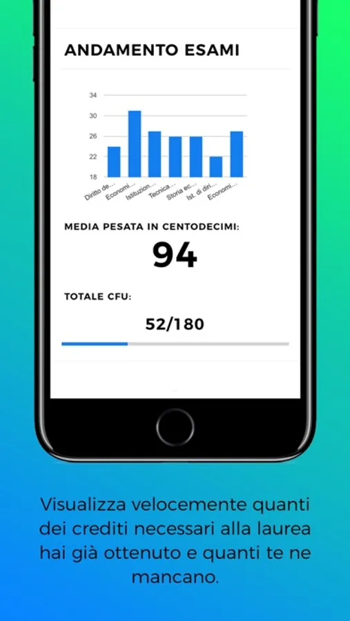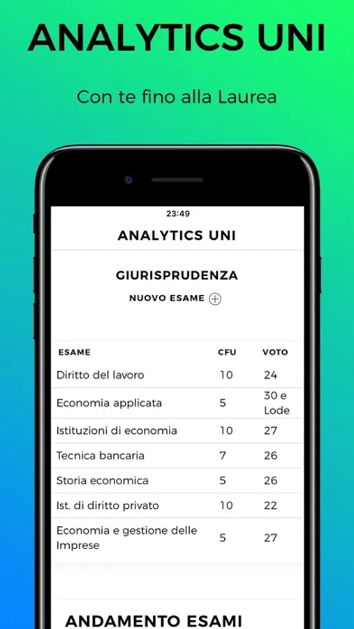 Il libretto che ogni studente universitario deve avere. Analytics Uni ti permette di avere un colpo d'occhio sull'andamento dei tuoi esami in tempo reale. Potrai aggiungere i tuoi esami, modificarli, eliminare quelli che hai dato in precedenza e avere sempre a disposizione la media effettiva dei tuoi esami, pesata in base ai CFU di ogni esame e in centodecimi.