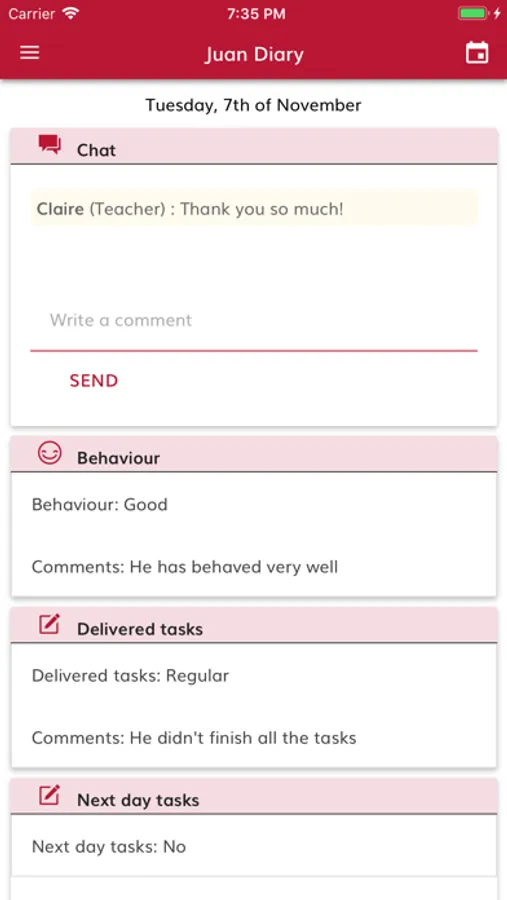 Diary: you will find what has happened today; Behaviour, Tasks and Homework, Meals, Drinks and a Chat of observations between the students, the parents and the teacher.
