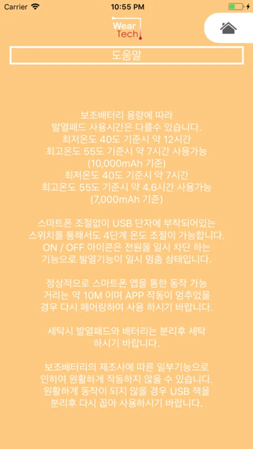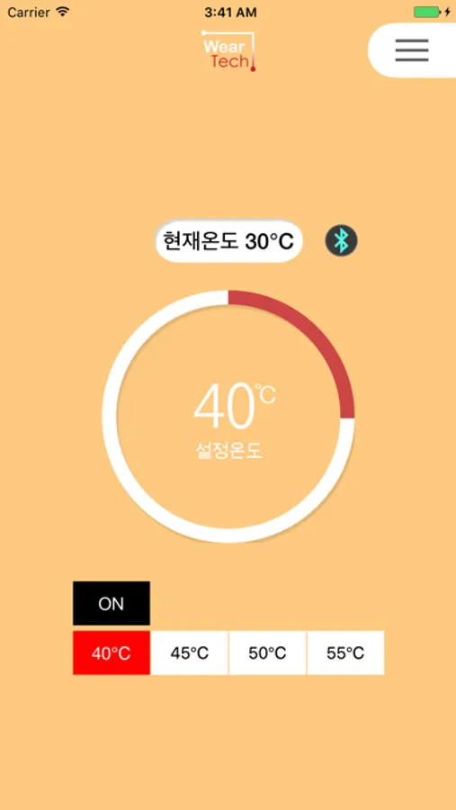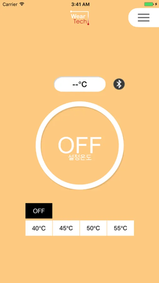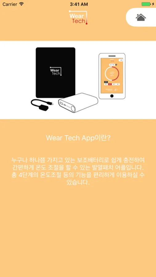 Wear Tech(웨어텍) 어플리케이션은 스마트폰을 이용하여 의류에 부착된 발열패드를 단계별로 온도를 선택할수 있도록 하고, 의류내 온도를 사용자가 원하는 온도로 유지하도록 자동으로 조절하는 기능과 사용자 위치, 지역 온도정보를 제공하는 어플리케이션입니다.